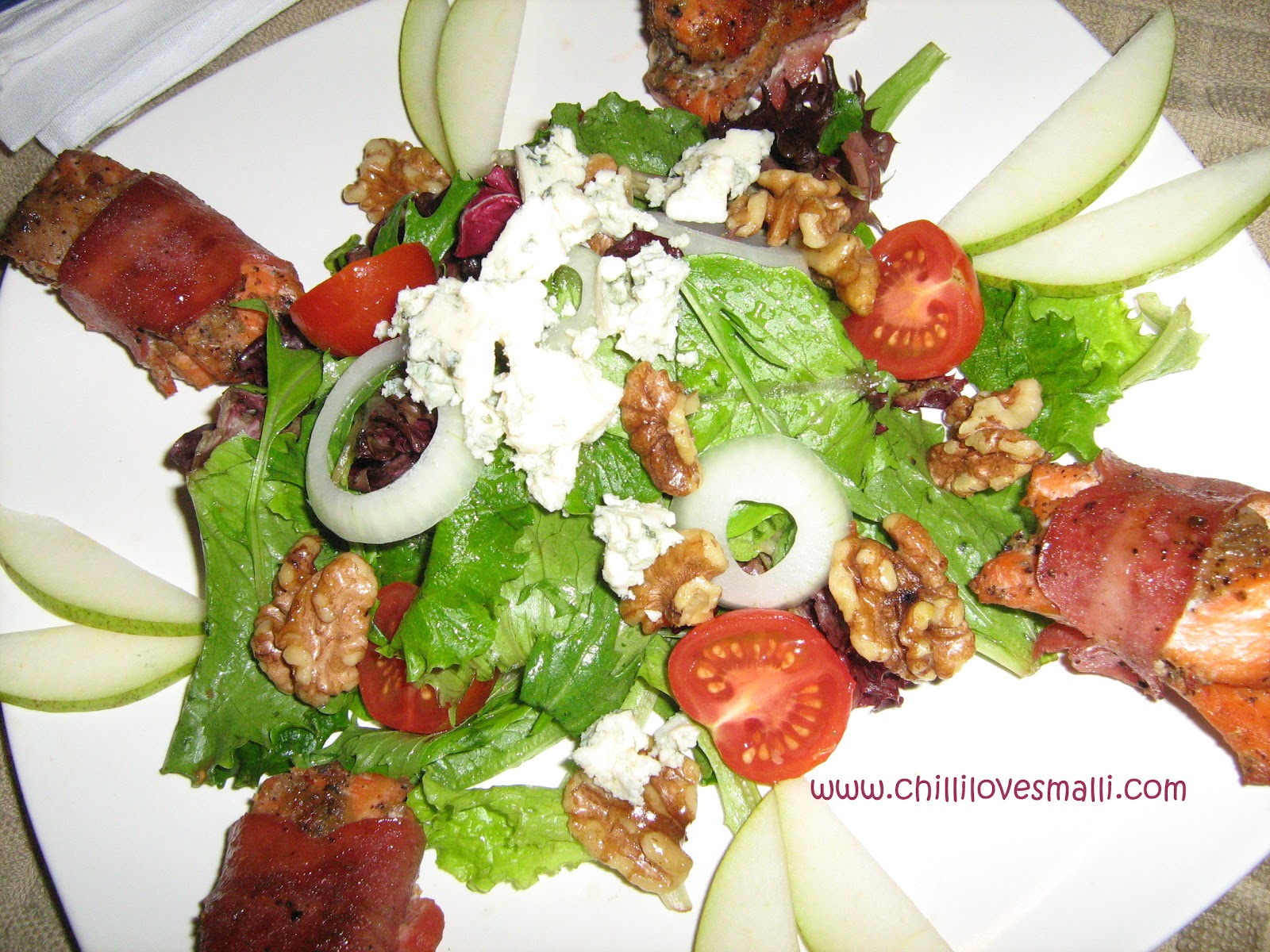 - Now, top the salad with onion rings, crumbled blue cheese and candied walnuts. Enjoy!!